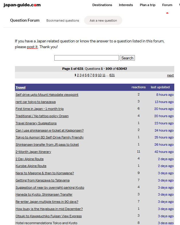 ジャパンガイドでは、英語圏旅行者に向けて日本の観光情報を日々発信していますが、サイト内の機能として、ユーザーが自由に質問を投稿できる掲示板「Forum」があります。ここでは、旅行者の旅マエのリアルな関心事や不安事が日々投稿されています。