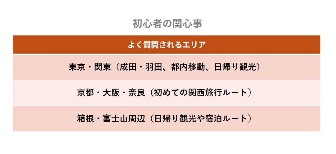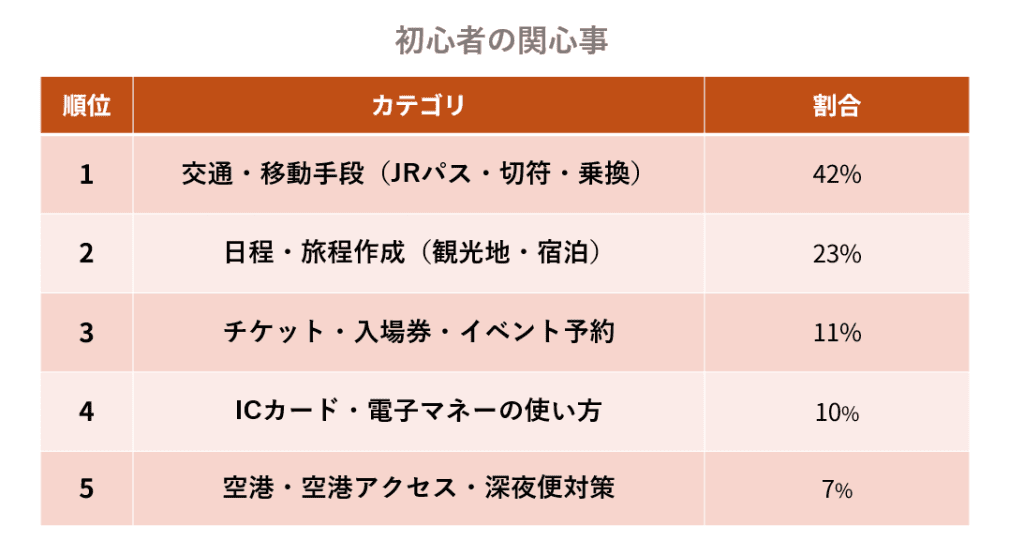 ・初心者は空港からのアクセス・都市部(東京・京都・大阪)を拠点とした基本的な交通情報を重点的に求めている