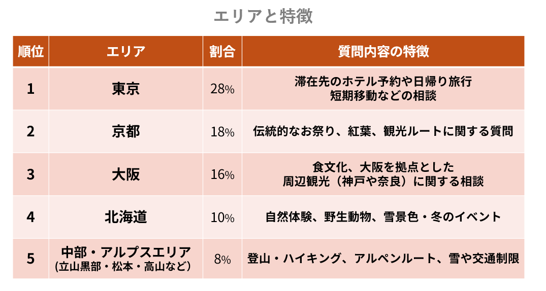 エリアによる違いとしては、東京や京都では、ホテルの予約・利便性・効率的な観光ルート(京都は歴史的な祭りや体験)に関する情報にニーズがあるのに対して、大阪では食文化や周辺の都市観光、北海道や中部では、自然体験・雪景色・登山などアクティブな体験が求められているなど、地域により特色がはっきりしていることがわかります。