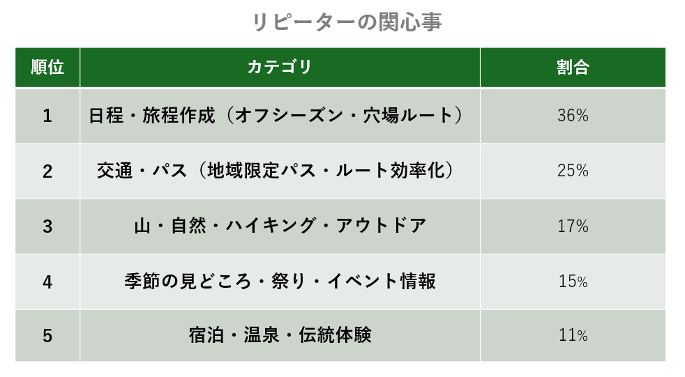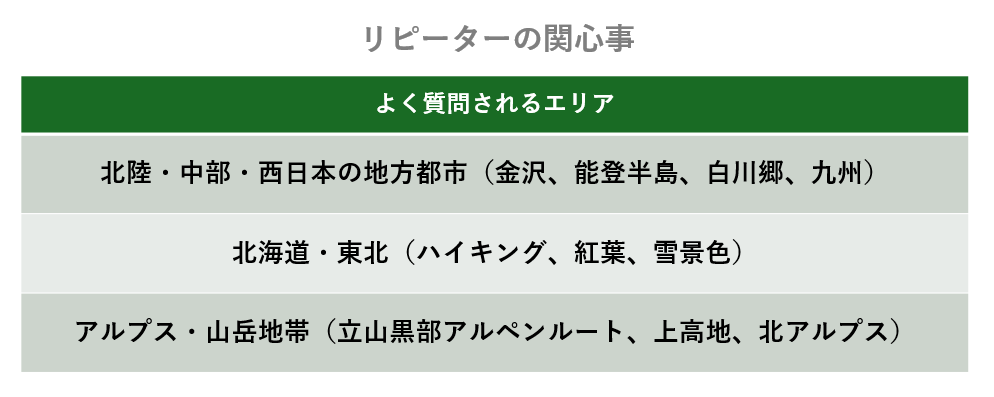 初心者と比べて、都市部よりも地方に関する質問や、季節ごとの楽しみやより深い体験に関する質問が中心です。